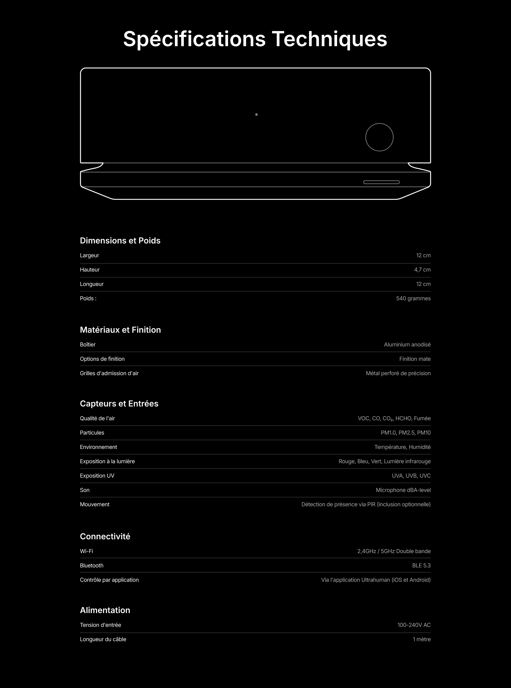 Ultrahuman Home est fabriqué à partir de matériaux durables et de haute qualité pour garantir une fiabilité à long terme. Son boîtier extérieur est fabriqué à partir de plastiques et de métaux durables et éco-responsables, tandis que ses composants internes intègrent des capteurs de précision et des circuits imprimés sur mesure, optimisés pour la détection environnementale en temps réel.